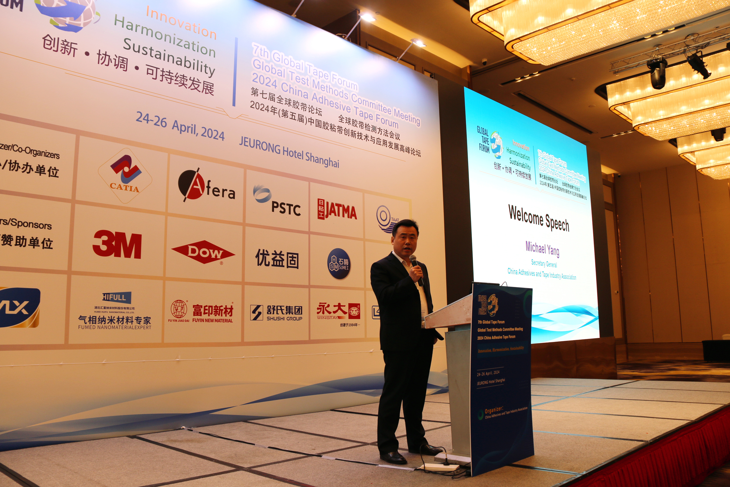 由中国胶粘剂和胶粘带工业协会主办,欧洲胶带行业协会(AFERA)、美国压敏胶带委员会(PSTC)、日本胶粘带制造商协会(JATMA)、台湾区粘性胶带工业同业公会(TAAT)协办的第七届全球胶带论坛、全球胶带检测方法会议暨2024年(第五届)中国胶粘带创新技术与应用发展高峰论坛于2024年4月25日在上海中庚聚龙酒店盛大开幕。会议得到了3M中国有限公司、陶氏(上海)投资有限公司、河北优益固科技有限公司、昆山石梅新材料科技有限公司、江苏沃航高科技有限公司、美信新材料股份有限公司、湖北汇富纳米材料股份有限公司、安徽富印新材料股份有限公司、舒氏集团有限公司、永大(中山)有限公司以及广东科建仪器有限公司等提供支持、合作与协助,共吸引了来自海内外的胶粘带、标签、保护膜、压敏胶、离型材料及设备生产企业、贸易经销商、胶粘带下游用户代表以及科研院所的专家学者近500人参会。
